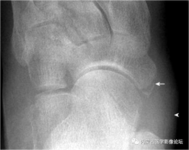 13.距骨喙:距骨颈缩短(箭头),头上缘隆起呈喙状(箭),为一种变异,需要与增生性骨赘鉴别,后者与距舟关节面相连,距骨头上缘多平直光整,不伴颈部缩短。
