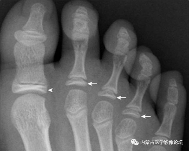 23.锥状骨骺:第2~4近节趾骨骨骺呈锥状(箭),多由生长紊乱引起,是一种变异。同时可见拇趾近节趾骨骨骺密度增高(箭头)。