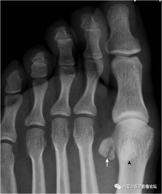 21.足趾副骨:趾跖关节内侧见点状骨性灶(箭),又称关节旁骨,一般无病理意义,但有时可引起邻近骨生长障碍和坏死。要与撕脱骨折鉴别。