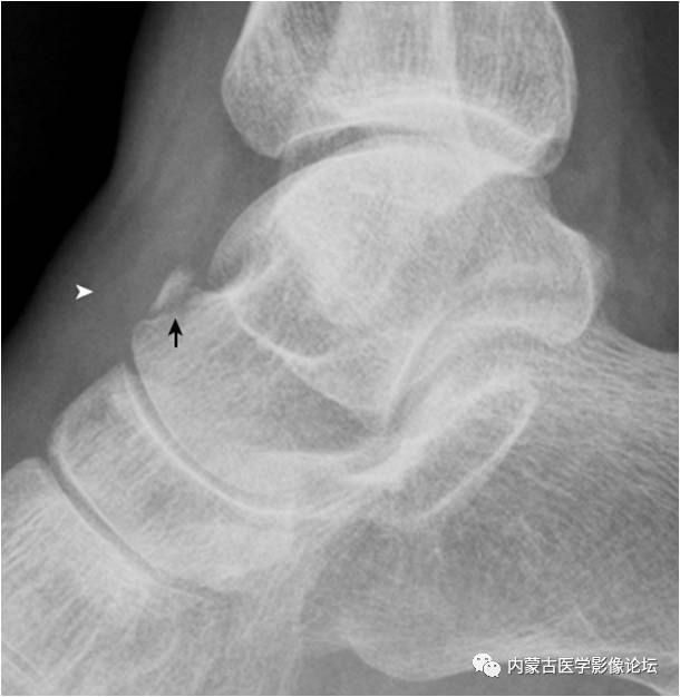 4.跟骨上副骨:呈跟骨上方、三角骨(白箭头)后方骨性结节(箭),为正常变异。腓骨副骨(黑箭头)与距骨重叠。