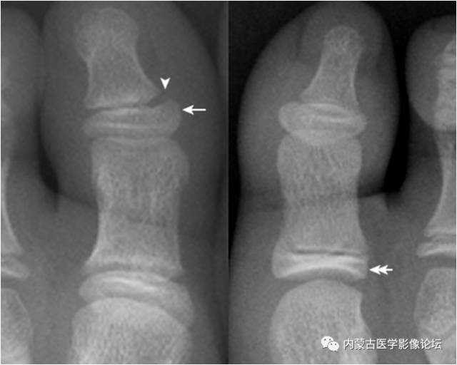 22.趾骨骨骺:拇趾远节趾骨骨骺内侧较外侧宽(箭),其与趾骨干骺端间距离较宽(箭头),为正常表现,勿误认为是骺离骨折。近节趾骨骨骺可呈扁平状,并密度增高,亦为正常表现,勿误认为坏死。
