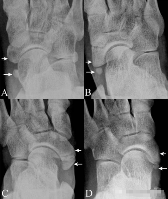 11.外胫骨:舟骨粗隆(短箭)的后内侧可见形态不一的外胫骨(长箭),A图为 I 型, B图为 II 型, C图为 III 型。D图示在明显突出的舟骨粗隆后见外胫骨( II 型),融合后即为 III 型。外胫骨需与舟骨撕脱骨折鉴别,临床表现和周围软组织改变可提供依据。