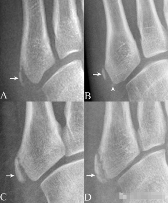 16.第5跖骨粗隆骨化中心:第5跖骨粗隆骨化中心(箭),形态多样,A(女,10岁)为线样且不连续,B(男,13岁)为多发(箭与箭头),C(男,12岁)为边缘光整,D(男,11岁)为内缘粗糙伴裂隙。需与撕脱骨折鉴别,其与粗隆长轴近似平行,而撕脱骨折为腓骨短肌肌腱牵拉所致,骨折线多为横行。