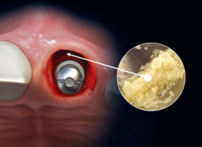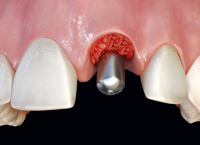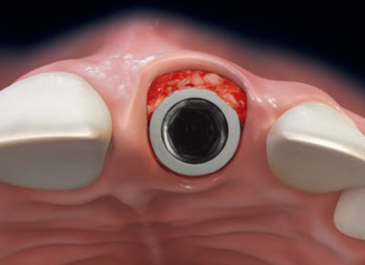 图6 即刻种植时使用小颗粒的同种异体矿化松质骨颗粒进行双区植骨,维持了牙槽嵴的轮廓
