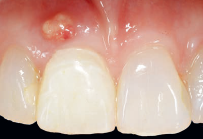 由于这类移植物颗粒不能及时吸收,成为了长期存在的刺激物。图2和3显示了一例薄龈生物型患者在植骨后愈合4.5个月,由于植骨颗粒穿透软组织形成唇侧瘘管。图4显示一例厚龈生物型患者,植骨材料包裹在软组织龈沟内,没有穿透较厚的软组织。