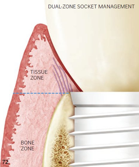 双区牙槽窝管理(Dual-Zone Socket Management),又名双区治疗(Dual-Zone Therapy),该理念最早由Stephen J. Chu等于2012年首次提出[1],是指在即刻种植中,使用双区植骨,联合应用临时修复体/个性化愈合基台封闭牙槽窝的治疗技术,目前已成为美牙区即刻种植中的常用技术之一。所谓“双区”(dual-zone),指的是牙槽窝即刻种植常常涉及的两个区:(1)骨区,是位于种植体颈部平台根方的区域;(2)软组织区,是位于种植体颈部平台冠方的区域(图1)。本文就双区植骨的操作流程及技术要点做简要介绍。