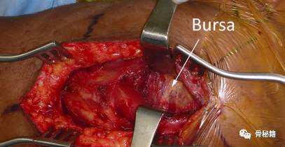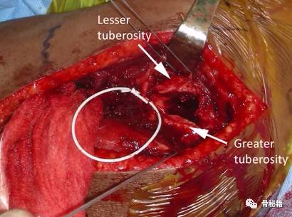 然后就可以进入肱骨近端了,整体暴露图 上方为小结节,下方为大结节。