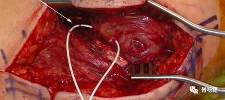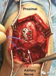 该腋神经横跨肱骨干,需要小心分离保护,不能过度牵拉