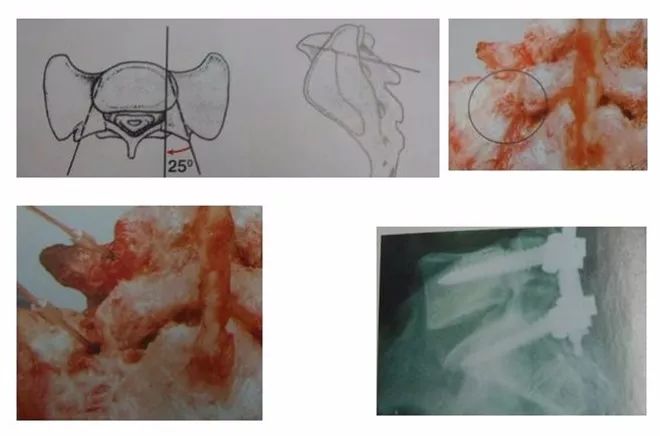 Magerl 法:进钉点位于侧块后壁中点内上方1-2mm;进钉方向外倾25-30°、头倾30 °(平行上关节面)钻孔,钻透对侧皮质;测深后拧入3. 5mm皮质骨螺钉。