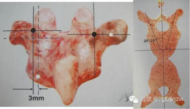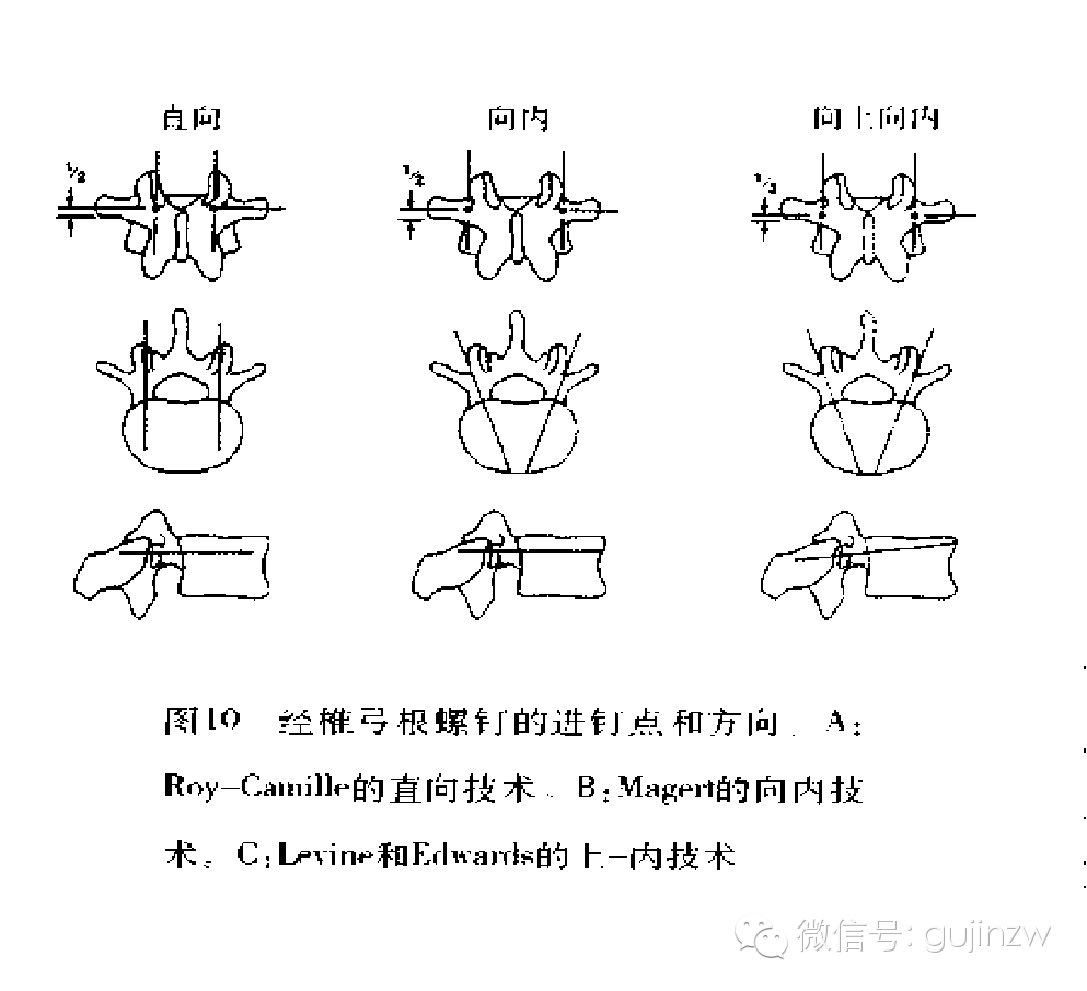 1、Margel和Roy Camille以横突中点水平线与上关节突外缘垂线的交点为进钉点。