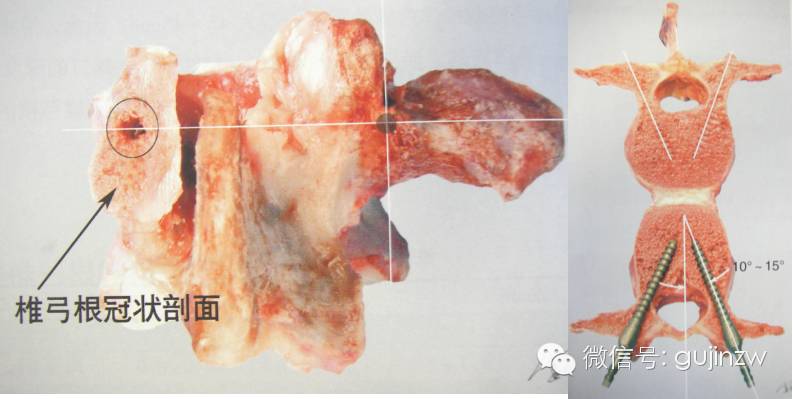 有些学者采用椎弓根外侧置入,很好的解决了这个问题。进钉点选横突的尖端,横突中线水平,先转一小洞,锥子的指向与该椎小关节外侧缘相交。与矢状面的夹角为25—40度,自T12向上度数逐渐增加。