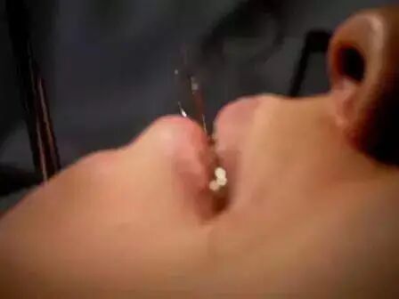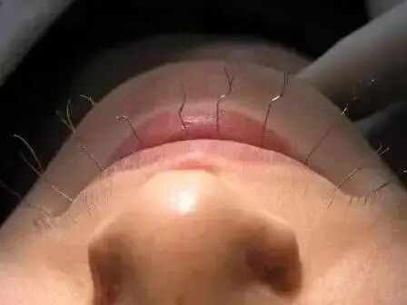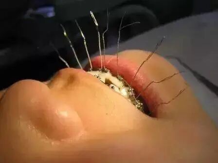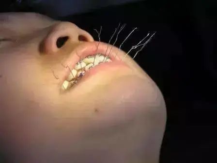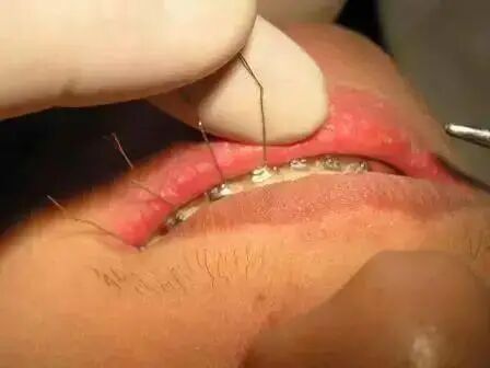 【操作要领提示】上颌弓丝结扎后从头顶俯视,结扎丝沿口裂呈扇形散开,侧面观竖直成排的结扎丝在一条直线上。