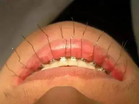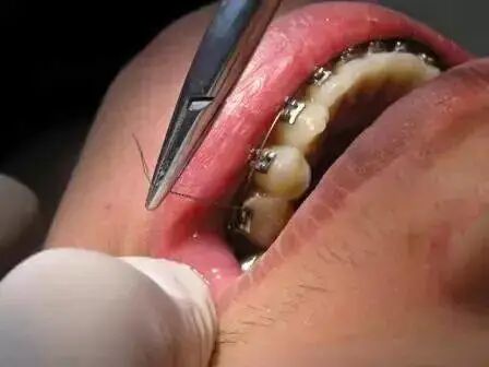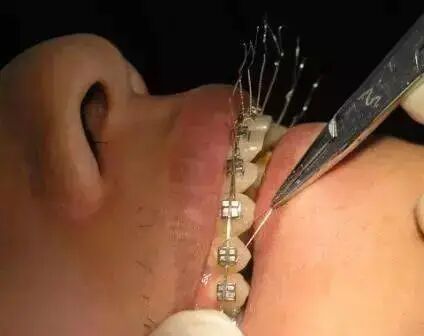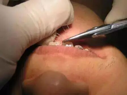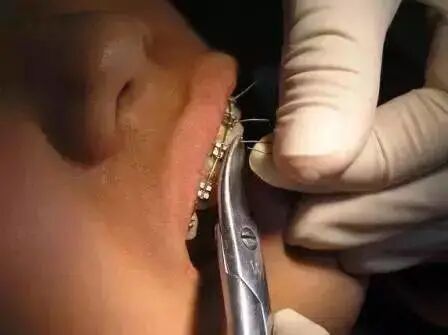直立排列整齐的结扎丝非常便于剪短操作程序的进行。在剪短结扎丝时,不要剪一根丢一根。笔者习惯用左手指捏住2~3根结扎丝,右手持金冠剪预留其根部3~4毫米长,剪断这组结扎丝后,左手指略松开向旁边移动,再捏住2~3根结扎丝,右手持金冠剪继续剪断扎丝。如此交替操作,可一口气剪完半口结扎丝,操作既便利又快捷。