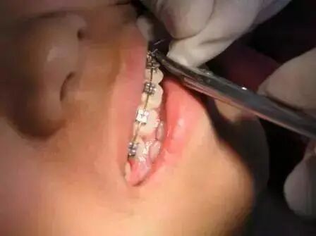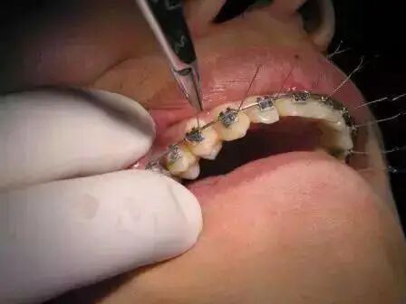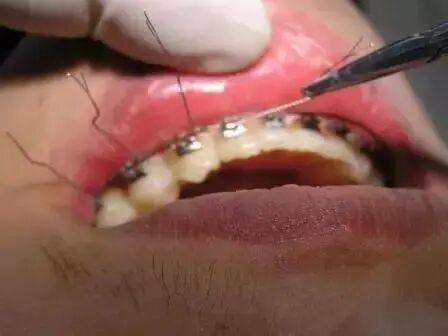 每扎完一根结扎丝,用持针器或左手指顺手将该结扎丝竖直,使其与牙弓垂直成扇形排列。固定正畸矫治弓丝采用持针器结扎法是临床上最常用的一种结扎方法。操作时首先将一根结扎丝对折成环圈状,持针器夹住结扎丝对折末端的1/3处,用手指将其末端捋平贴近持针器柄,这样持针器旋转打结时,不会与邻近结扎丝缠绕。每结扎完一个托槽应顺手将结扎丝立起与牙弓弧段垂直,成扇形排列,伸出口裂之外,这样不会扎伤患者嘴唇,也便于下一步骤的操作。
