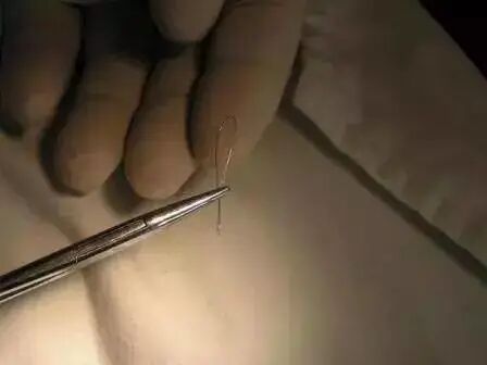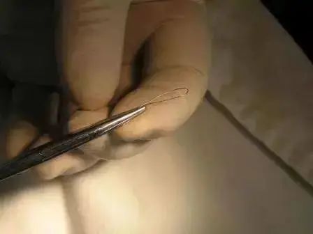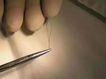 结扎丝对折后,持针器钳夹其末端1/3处 ,结扎丝末端用手指紧贴持针器 柄捋平, 结扎丝 圈与 持针器钳长轴在一条直线上。