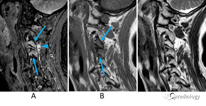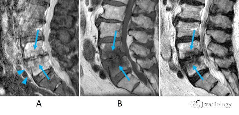 MRI图像显示L4/5椎间隙变窄和边界不清的骨质破坏(A-C箭)。在STIR(A)和T2WI(C)上骨髓信号呈弥漫性高信号,在T1WI(B)上呈低信号。STIR图像还可以看到相邻椎旁软组织的水肿和/或炎症(箭头)。