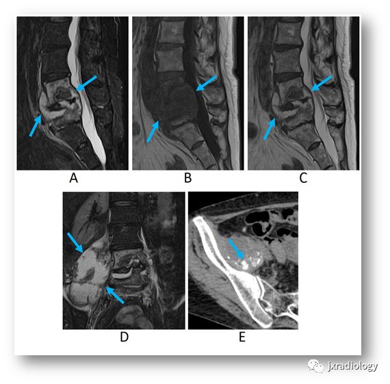 MRI图像显示在L4/5水平的椎间隙液体积聚伴相邻椎体骨质破坏。在前后纵韧带下方(A-C箭)和右椎旁间隙(D箭)形成脓肿。CT图像显示脓肿内的钙化(E箭)。
