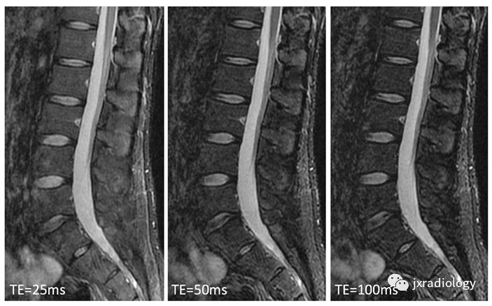 3种不同TE的腰椎矢状面STIR图像在相同窗宽/窗位水平设置下。TE的设置会影响图像的对比度。当TE设定较长时,肌肉和皮下脂肪的信号强度相对较低。