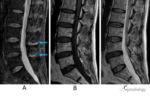 最初的检查(A-C)STIR上示终板的高信号并椎间隙变窄(A箭)。该区域在T1WI上呈低信号(B箭),在T2WI上呈高信号(C箭),表明Modic 1型终板变化。
