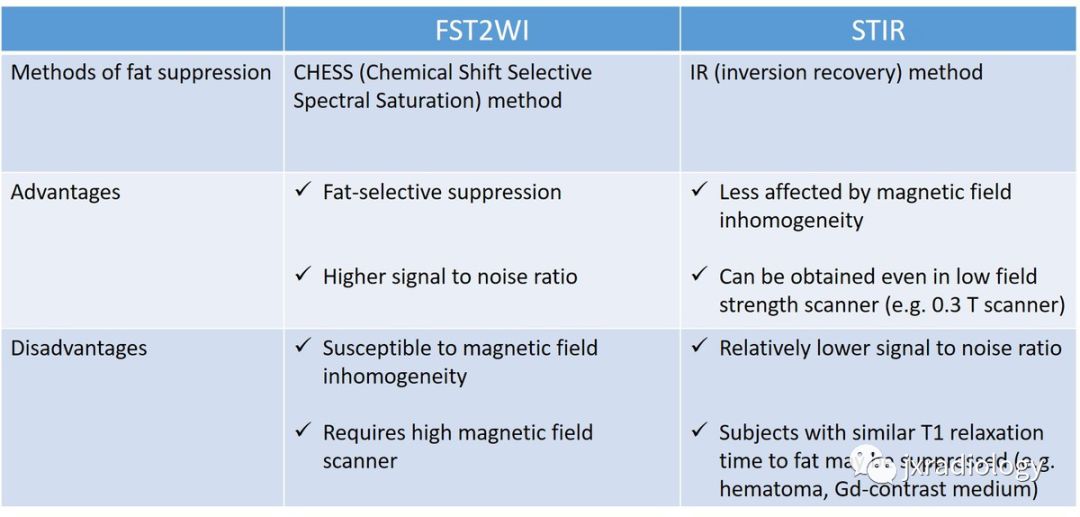 表1:脂肪抑制T2-加权图像(FST2WI)和短时间反转恢复序列(STIR); 方法、优点和缺点。