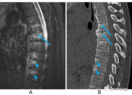 STIR图示椎体前角的骨髓高信号(箭头)。可以看到类似感染性脊椎炎的终板侵蚀和邻近椎体的一次信号(A箭头)。CT图示椎体前部(B箭头)中的骨硬化和韧带骨赘样改变。在CT图像(B箭头)中也可以看到终板腐蚀。