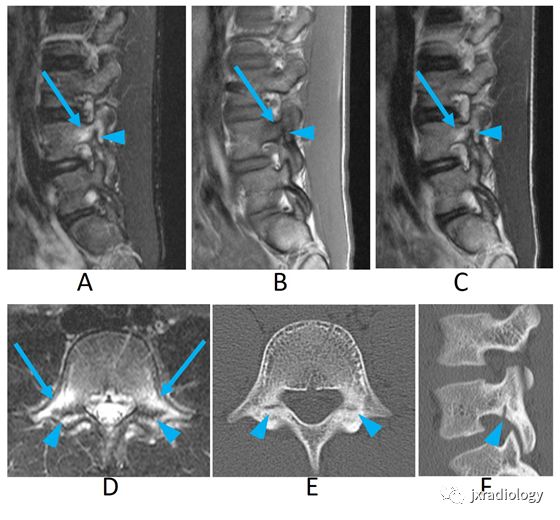 CT图示裂隙位于的关节突下部(E,F箭头),MRI图像上显示为低信号(A-D箭头)。