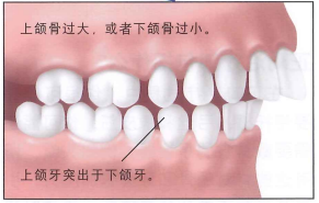 上颌骨太大突出于下颌骨。或者下颌骨可能太小。或者过度后缩。这种情况下引起“兔牙”。深覆颌通常由于骨性错颌引起。