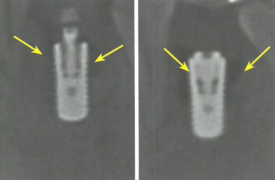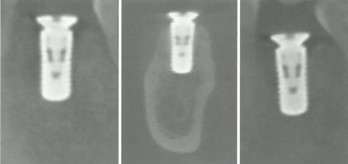 该医生重新对其CBCT进行了分析,看到冠状面上种植体并无异常,但从矢状面及根尖片进行观察时,大家觉得有什么问题呢?从矢状面上看,发现种植体颈部周围骨质有明显的吸收。