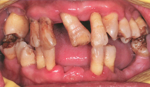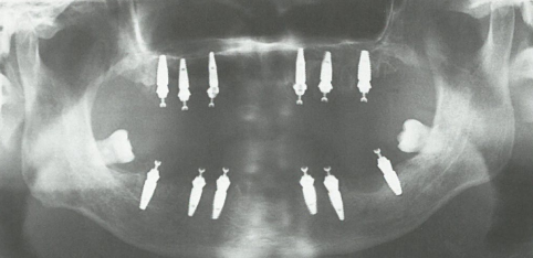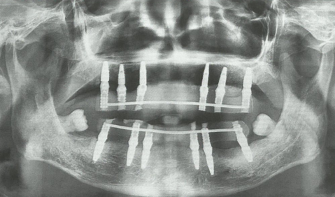 患者重度牙周炎,口内多颗牙缺失,余留牙有不同程度松动且无法保留。术中拔除口内松动余留牙,上下颌各植入6颗种植体后即刻负重。