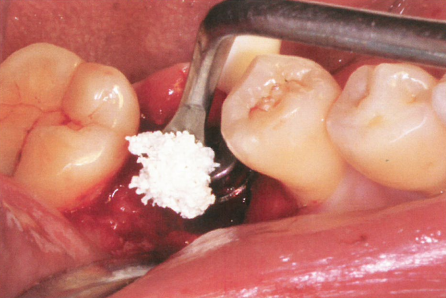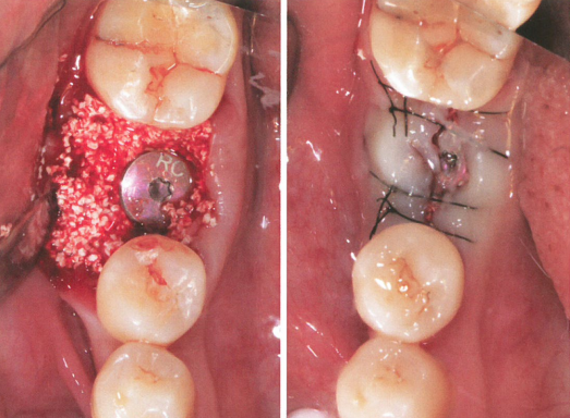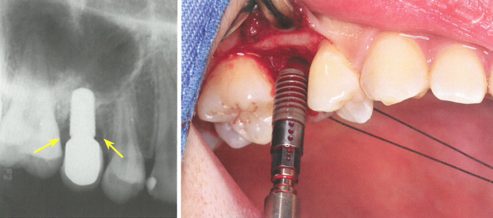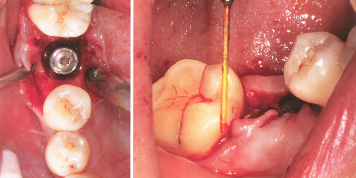 所以,当影像学检查显示种植体周围存在骨吸收,BOP(+)时,应在完善了牙周基础治疗后,对其进行再生性手术治疗,即对术区进行翻瓣,激光彻底去除种植体周软组织,填入骨粉,恢复种植体周围骨量。