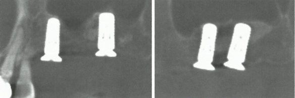患者双侧上颌后牙游离缺失,窦峭距最低处不足2mm,术中上颌窦提升,同时植入种植体,这种上颌窦内或种植体周围进行大量骨增量的情况,术后及二期术前复查,我们采用CBCT复查,可三维分析种植体位置及种植体周围骨的情况。