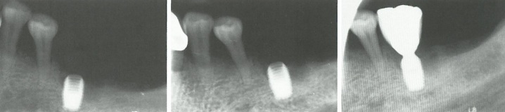 术后即刻,种植体位置良好,术后3个月,种植体周围无明显骨质吸收,戴牙后,种植体周围骨量维持良好。