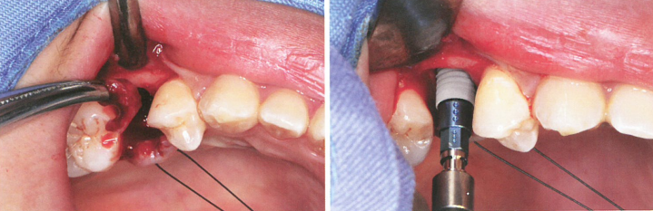 该医生在二期前并未注意到这一现象,而是盲目地进行了二期并取模,最终加力时造成了种植体的松动。随后,医生将松动种植体取出,并在去除种植窝内肉芽组织后,重新备洞,植入了直径更大的种植体,以获得良好的初期稳定性。
