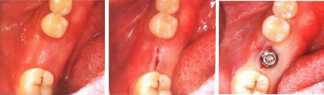 3. 于种植体覆盖螺丝所在的牙槽嵴顶粘膜处行粘膜下浸润麻醉。