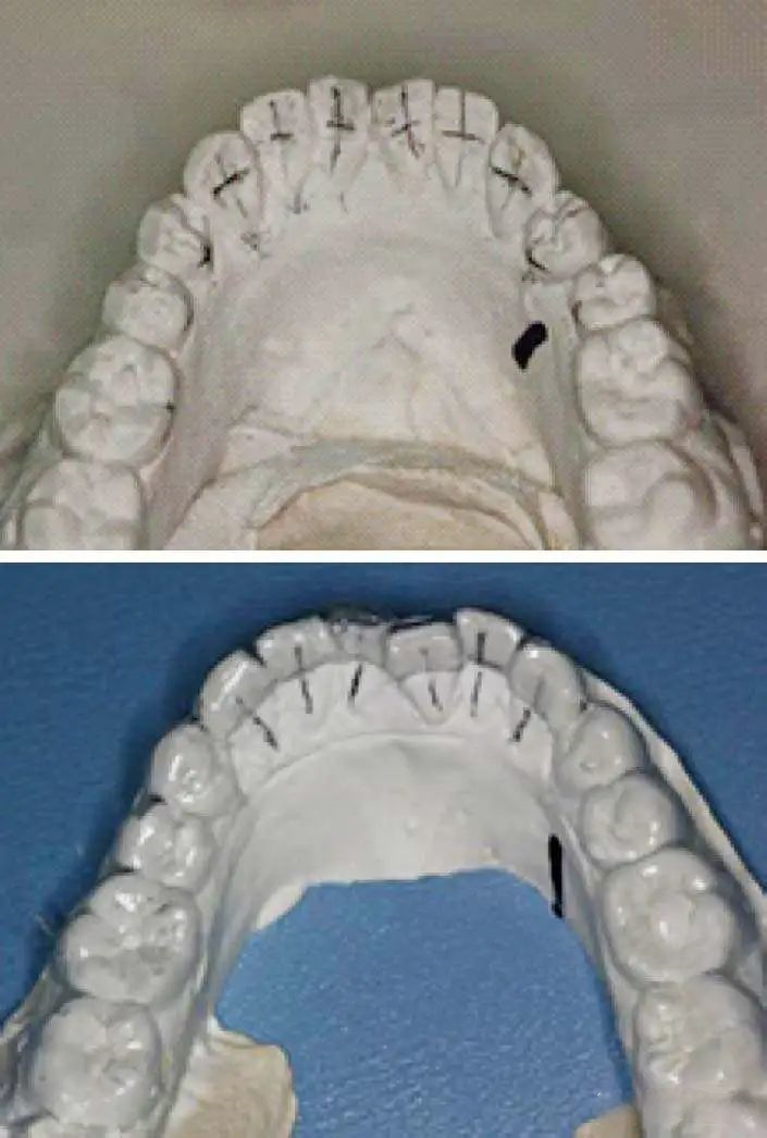 (1)在石膏模型上画线:画出牙齿舌面长轴,双尖牙区设定临床冠中心作为托槽高度。3-3的舌侧托槽高度基本上和唇侧定位比例一样。