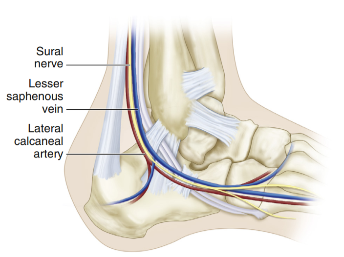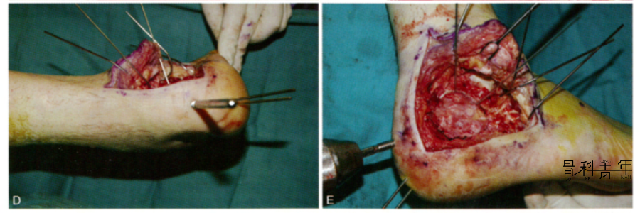 在跟骨外侧,需直接切至骨膜表面,将皮瓣全层掀开,避免损伤腓肠神经。皮瓣翻起后,采用克氏针固定于周围骨质,暴露跟骨外侧壁,同时避免损伤皮瓣内神经。