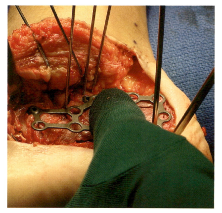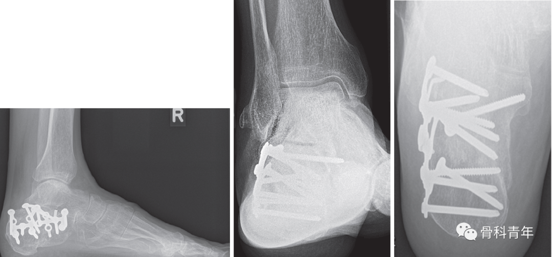 透视侧位接骨板位置,首先固定钢板前上方的螺钉,后术者用拇指下压接骨板恢复跟骨宽度,中指和环指纠正内翻。