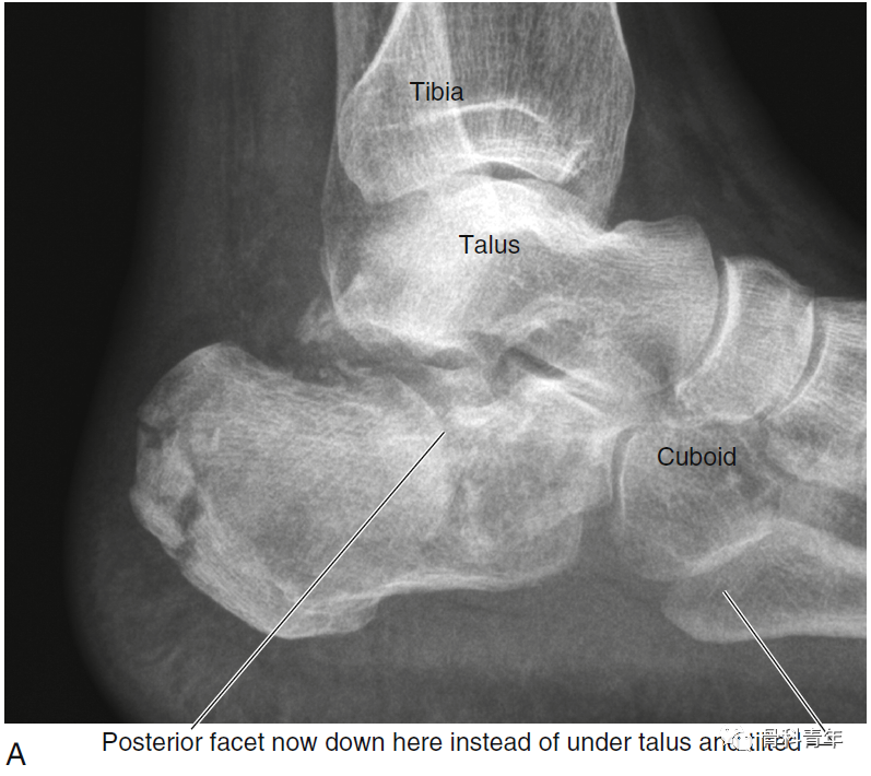 Gissane角:跟骨前后关节面之间的夹角,由跟骨外缘两条坚硬皮质骨柱的延长线构成,一条在后关节面的外缘,另一条位于前关节面的外侧,并向前延伸至跟骨前关节突的前部,正常范围在120-145°,该角度增大表明跟骨后关节面塌陷。