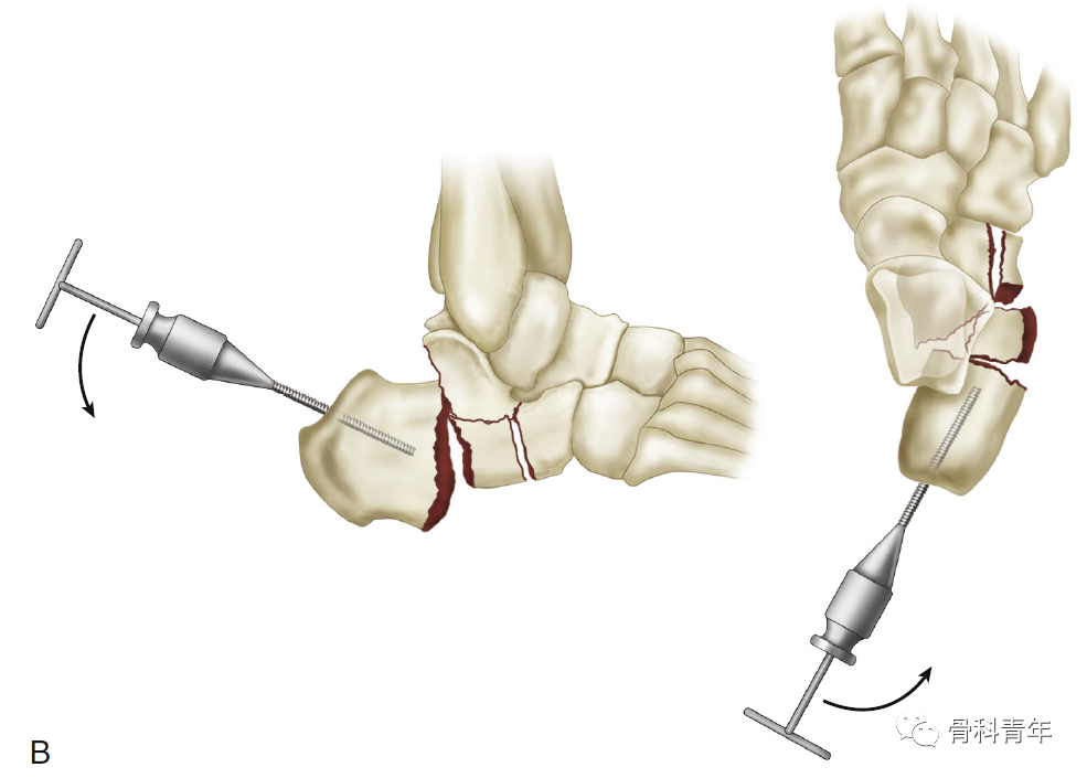 将4.5mm斯氏针置入后外侧骨块,操作骨折块复位;将跟骨结节骨折块复位与载距突上,纠正内翻,恢复高度。并沿足底穿入克氏针临时固定。