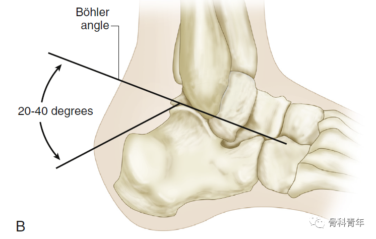 Böhler角:即跟骨结节关节面角。跟骨结节与跟骨后关节突连线,与跟骨前后关节突连线夹角,正常为35-45°。后关节面塌陷时该角减小。