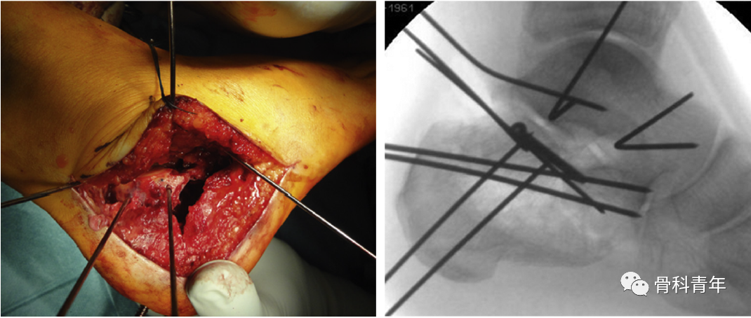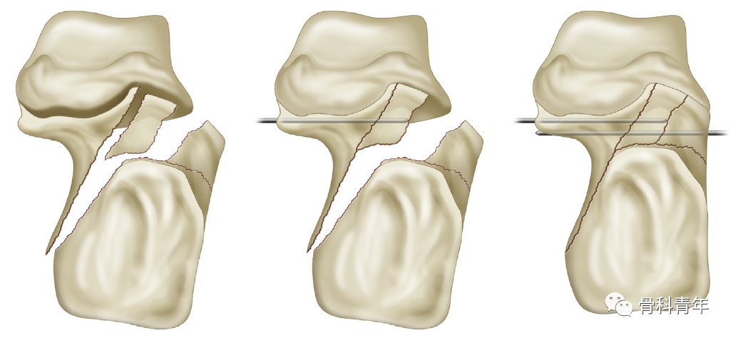 克氏针临时固定复位的关节面,此时后关节面复位后如存在较大缺损,则需植骨;