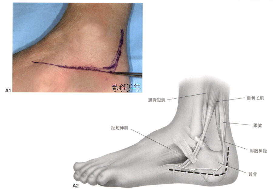 患者取侧卧位,骨性突起处垫衬垫。自外踝上方2cm跟腱外侧纵行向下切开,与足跟部和脂肪垫间连线相连续,往远端至第5跖骨基底。