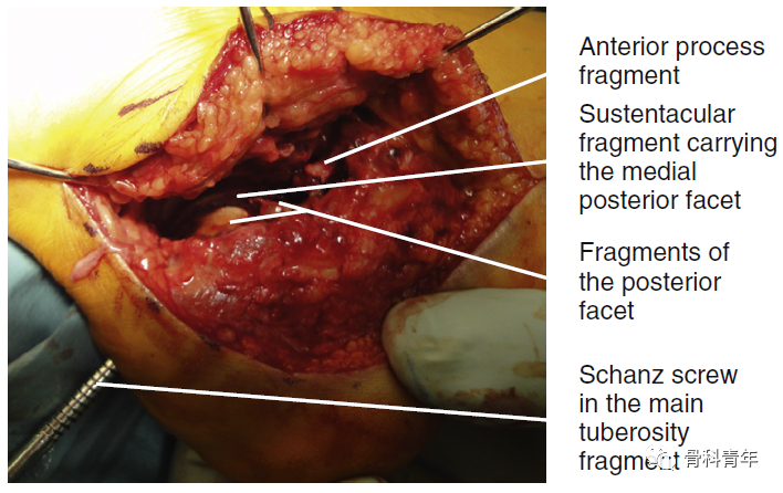 3. 骨折复位与固定皮瓣掀开后暴露跟骨外侧壁,此时跟骨外侧壁可能阻挡骨折复位及骨折线的观察,将外侧壁骨块取出;