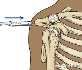 肩锁关节的形态作为肩峰切除的标志,箭头指示切除方向。