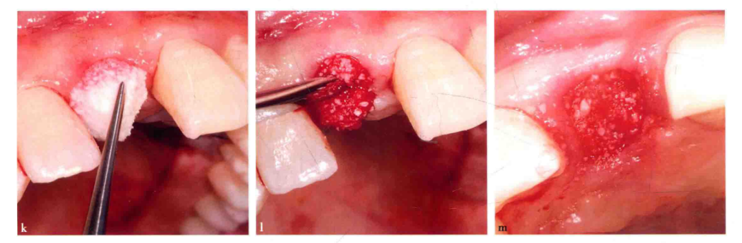 拔牙窝彻底清创之后,植入合适大小Bio-Oss Collgen,压实材料,拔牙窝内出血浸透移植材料,在冠方,移植材料表面平齐拔牙窝颈部龈缘。