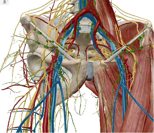 血管:髂血管、股血管、闭孔血管、臀上/下血管、死亡冠(Corona mortis / crown of death,腹壁下血管与闭孔血管的交通支)等。