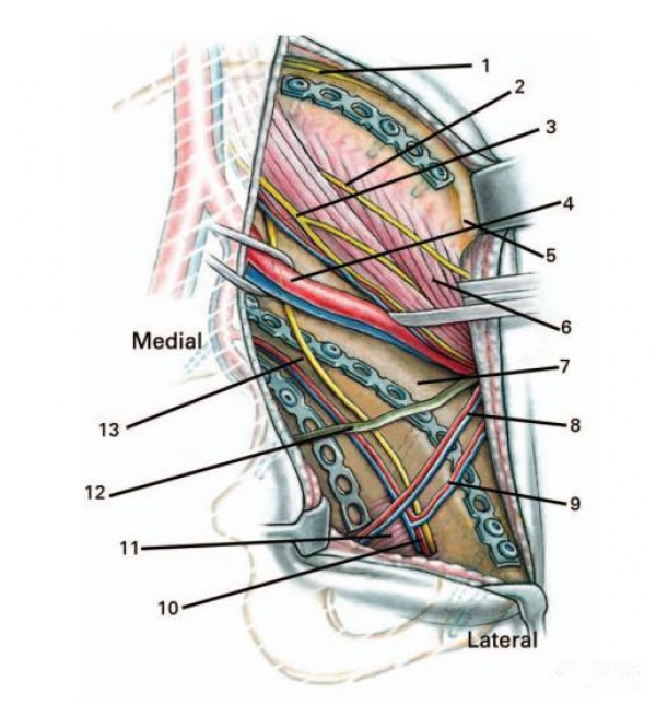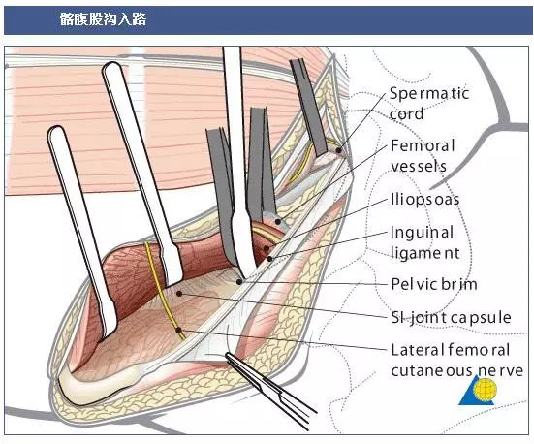 风险:可能导致股外侧皮神经、股血管、股神经等结构的损伤,扩大显露范围还可能造成闭孔神经和血管损伤。