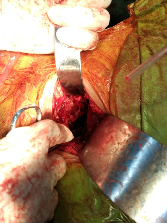 上述切口经腹直肌间筋膜(腹白线)直达腹横肌后方(切开腹横筋膜),在腹横筋膜与膀胱之间可有间隙,吸净损伤后的血肿,伸进手指钝性分离膀胱与腹横筋膜,这时应保证膀胱不充盈(无尿液,术前应导尿),然后提起腹横筋膜,向上切开至足够手术操作空间,向下切开跨越耻骨联合前上方,不需要从耻骨支上分离腹直肌,通过牵开腹直肌肌腹,一次牵开一边,可以得到充分的手术视野。有时候腹直肌在耻骨支上的止点有部分撕裂。视情况可部分切断腹直肌止点,不可全部切断。然后用手指钝性分离耻骨后间隙(Retzius间隙),灌洗并排出损伤后血肿。