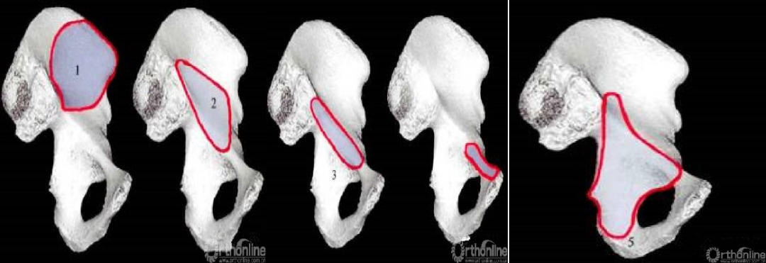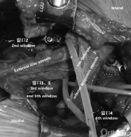 窗口1:髂嵴和髂腰肌之间,将肌肉向内侧牵拉。暴露髂骨。窗口2:髂腰肌和髂外血管之间。将髂外血管向内侧牵拉,髂腰肌向外侧牵拉,暴露骶髂关节,耻骨支。窗口3:髂外血管和输精管之间。暴露耻骨支,髂耻隆起,骨盆边缘。窗口4:输精管内侧。显露耻骨联合。窗口5:与窗口3类似,但位于真骨盆深面,可暴露方形区和坐骨棘。可从内侧进行钢板的置放。