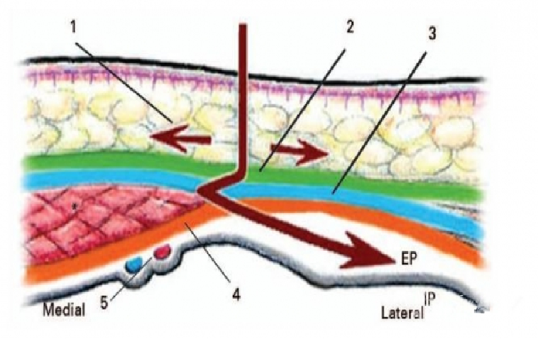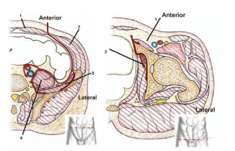 1)皮下软组织、筋膜;2)前腹壁的深层(绿色);3)腹直肌鞘(蓝线);4)腹横筋膜(橙色);5)腹部血管(EP,腹腔外黑线,IP,腹腔内空间)。